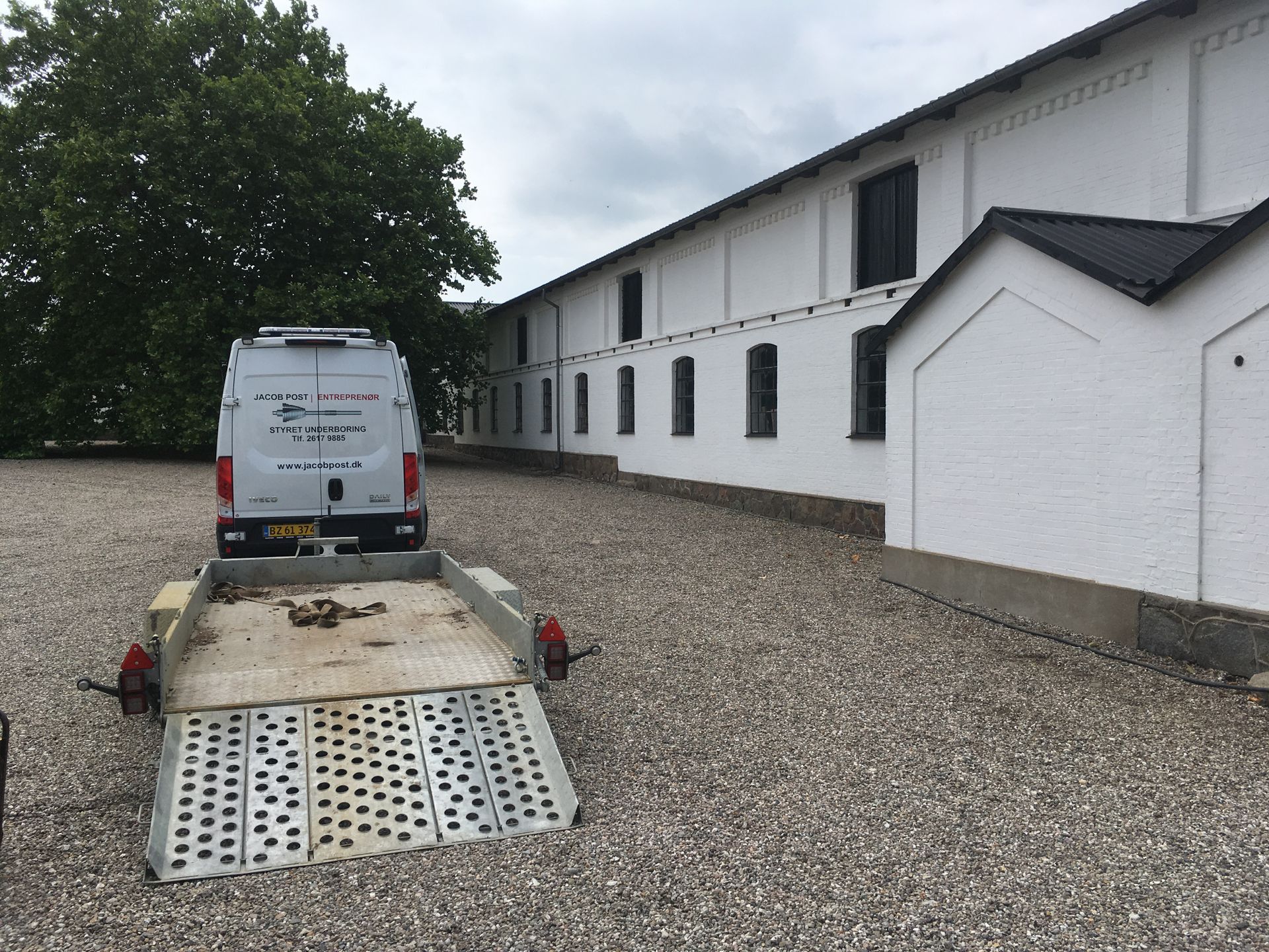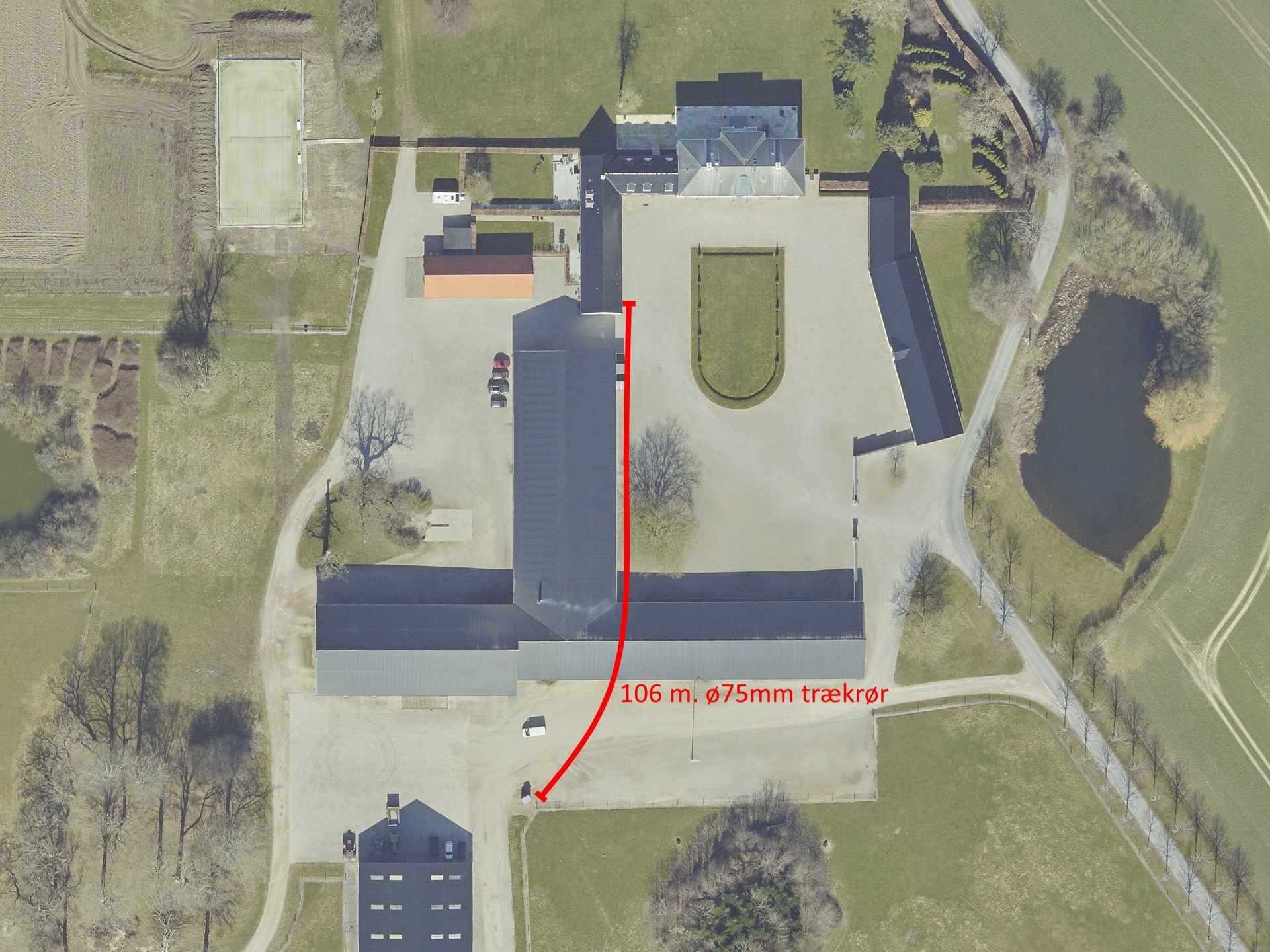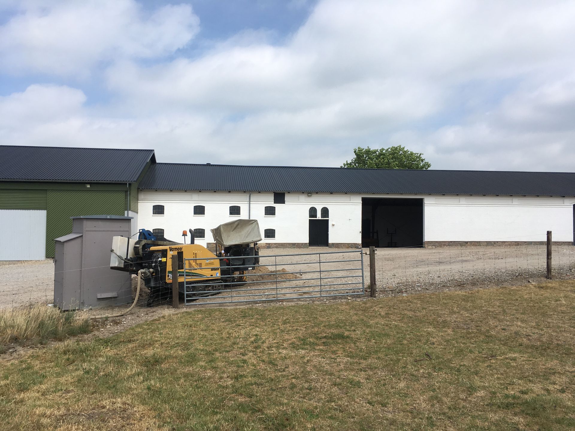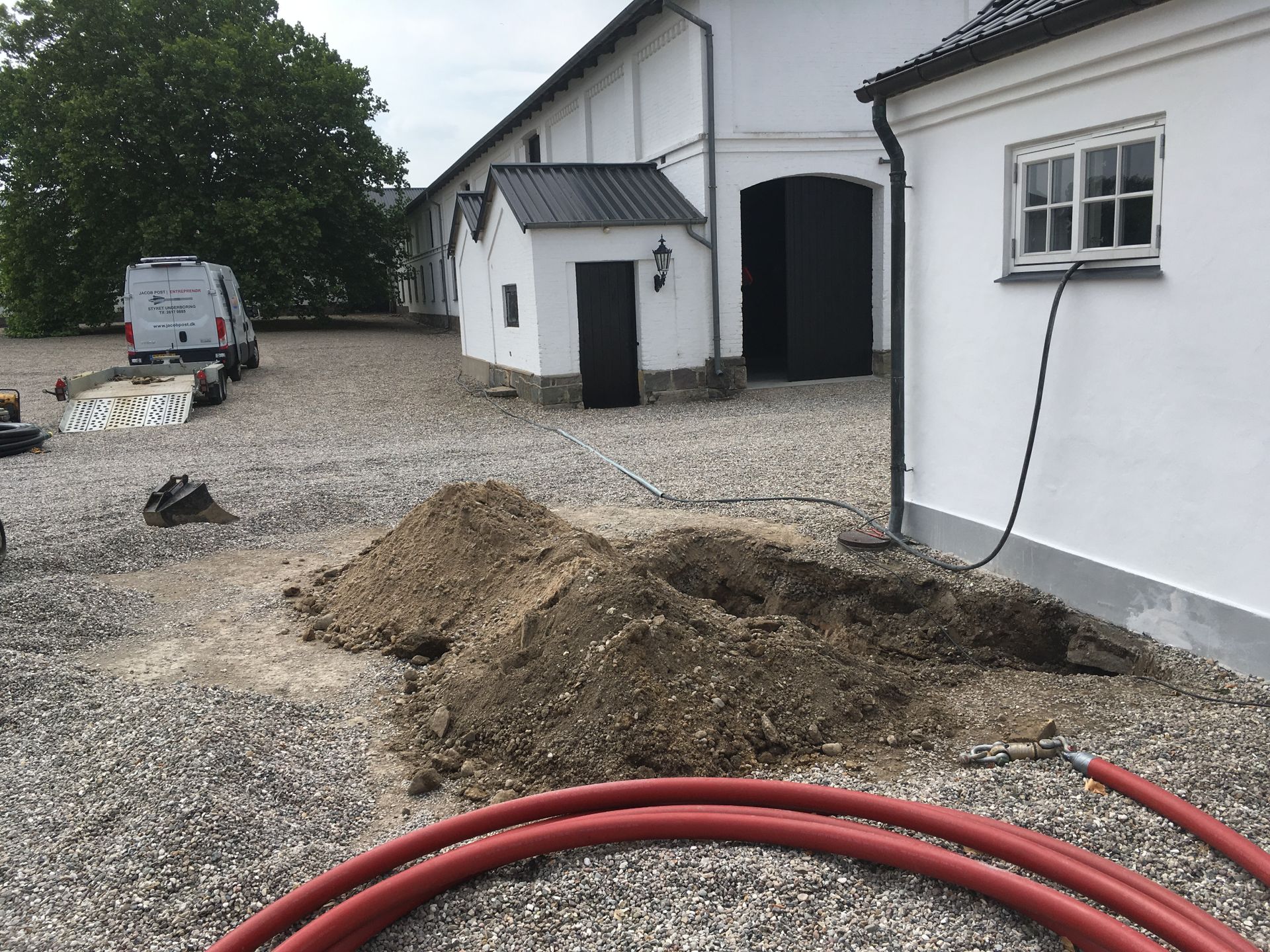 Et godt eksempel på hvor styret underboring kan være en rigtig god løsning. Man skulle bruge et nyt kabel til en bygning inde i gårdspladsen. For at undgå at skulle grave et langt stræk rundt om bygningen og på tværs af gårdspladsen, borede vi et Ø75mm trækrør fra transformatoren, under en lade og hen til hvor strømmen skulle bruges.